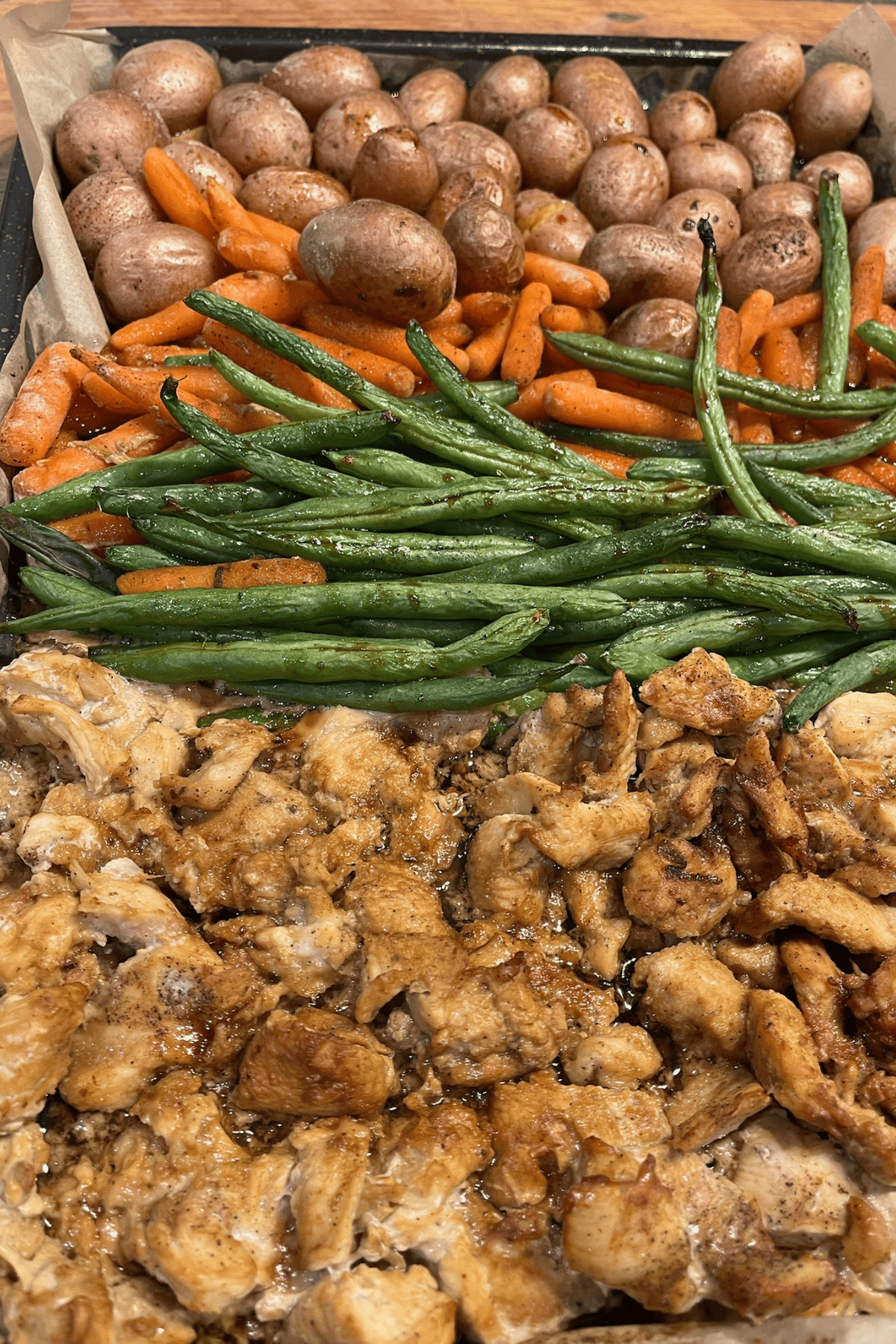 A simple one-pan dinner made with teriyaki-seasoned chicken, roasted potatoes, green beans, and carrots — finished with a drizzle of Japanese BBQ sauce.