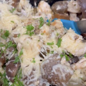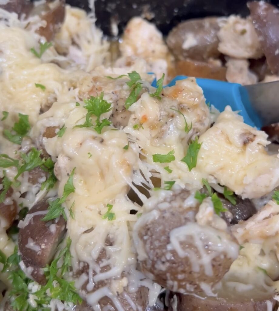 After chicken and potatoes are cooked, top with shredded Parmesan cheese & parsley.