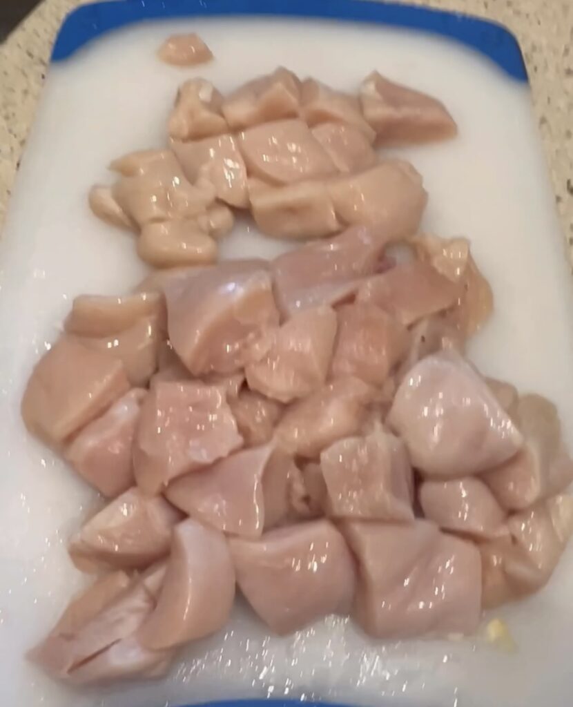 - On a cutting board take chicken breasts and cut into cubes. You can also cut the potatoes as well if you would like this helps to give a more even cook on chicken and potatoes.