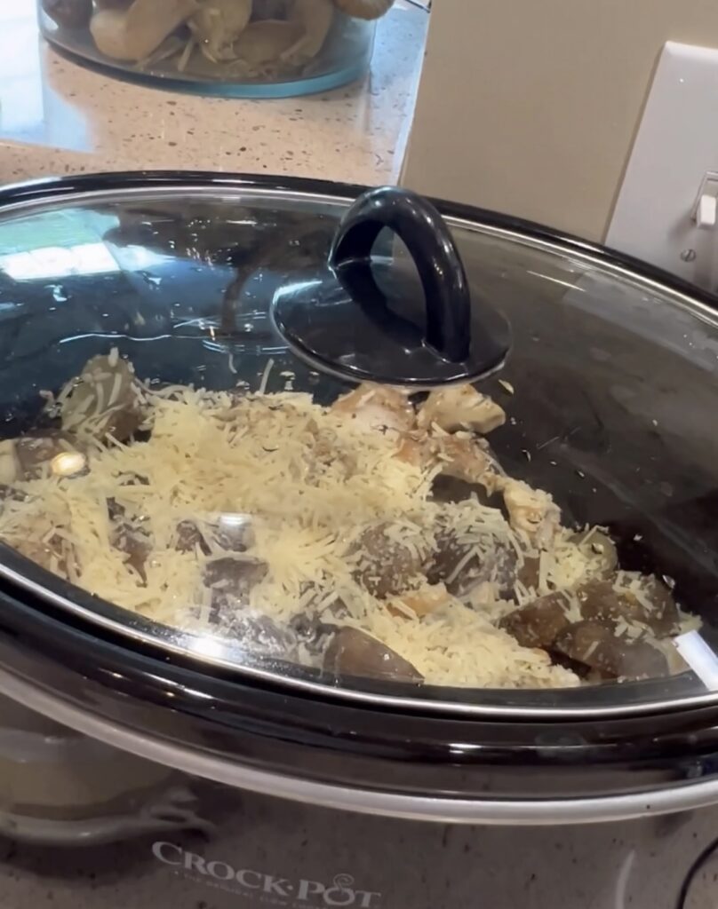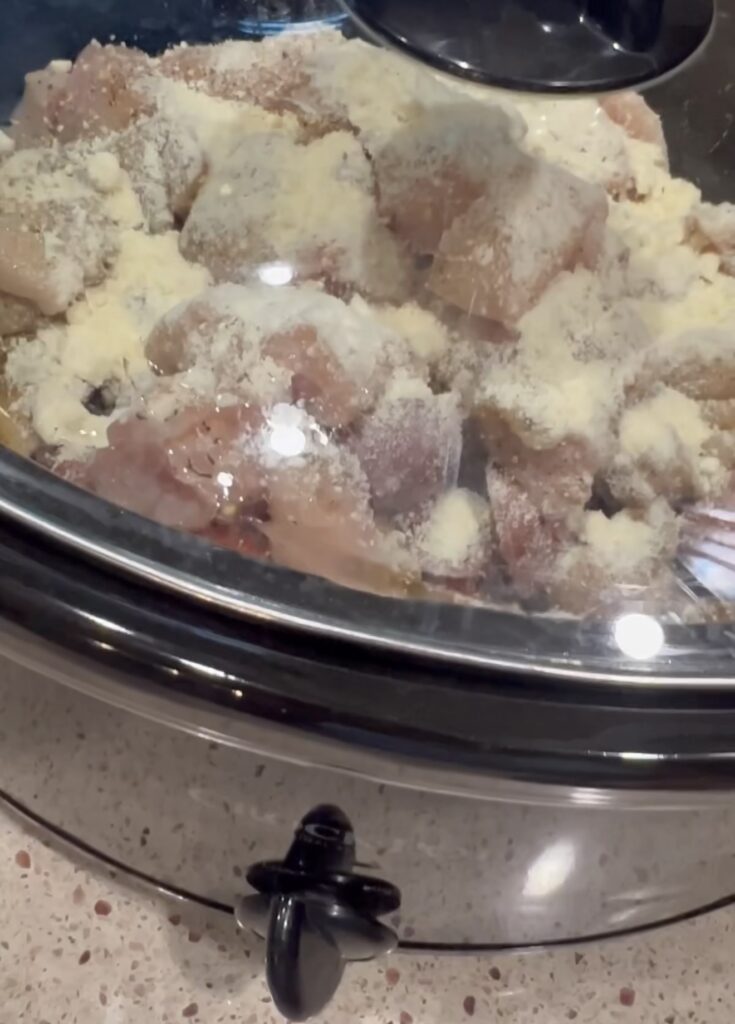 then including cubed chicken on top EXCEPT the shredded Parmesan cheese to the slow cooker.