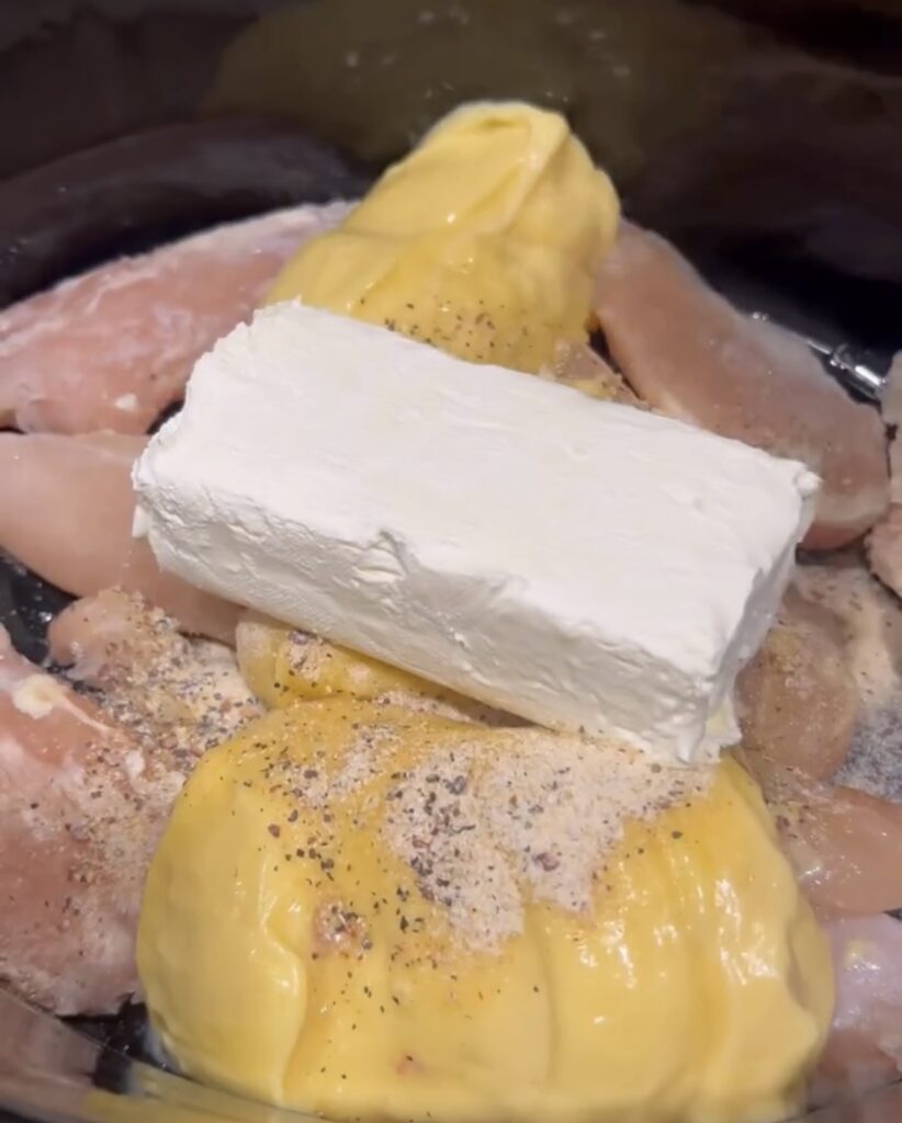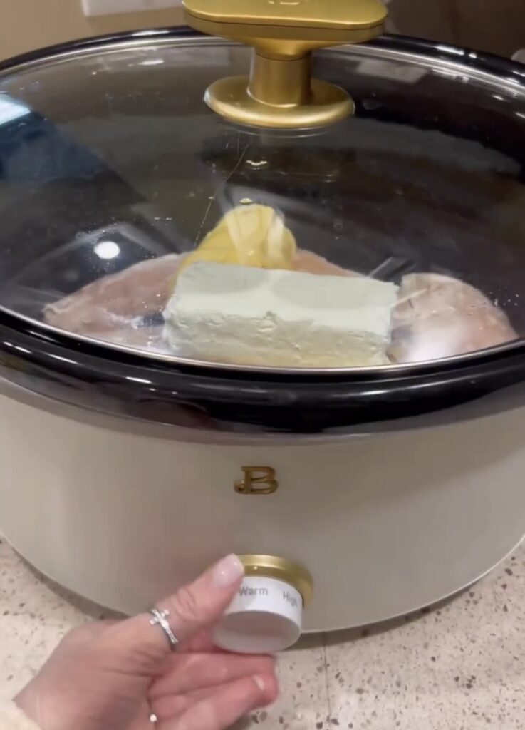 - add 3-4 chicken breasts in the bottom of a slow cooker