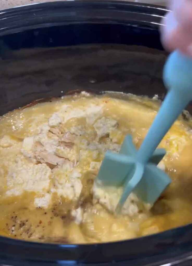 Cook the noodles for 7-8 minutes until done. Strain them and add the cooked noodles to the slow cooker with the shredded chicken.