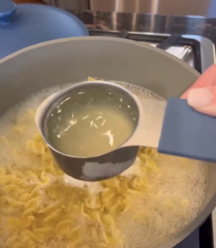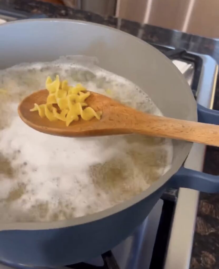 Once the chicken is done, grab a large pot, fill it with water, and bring it to a boil. Then, pour in 16 oz of egg noodles.