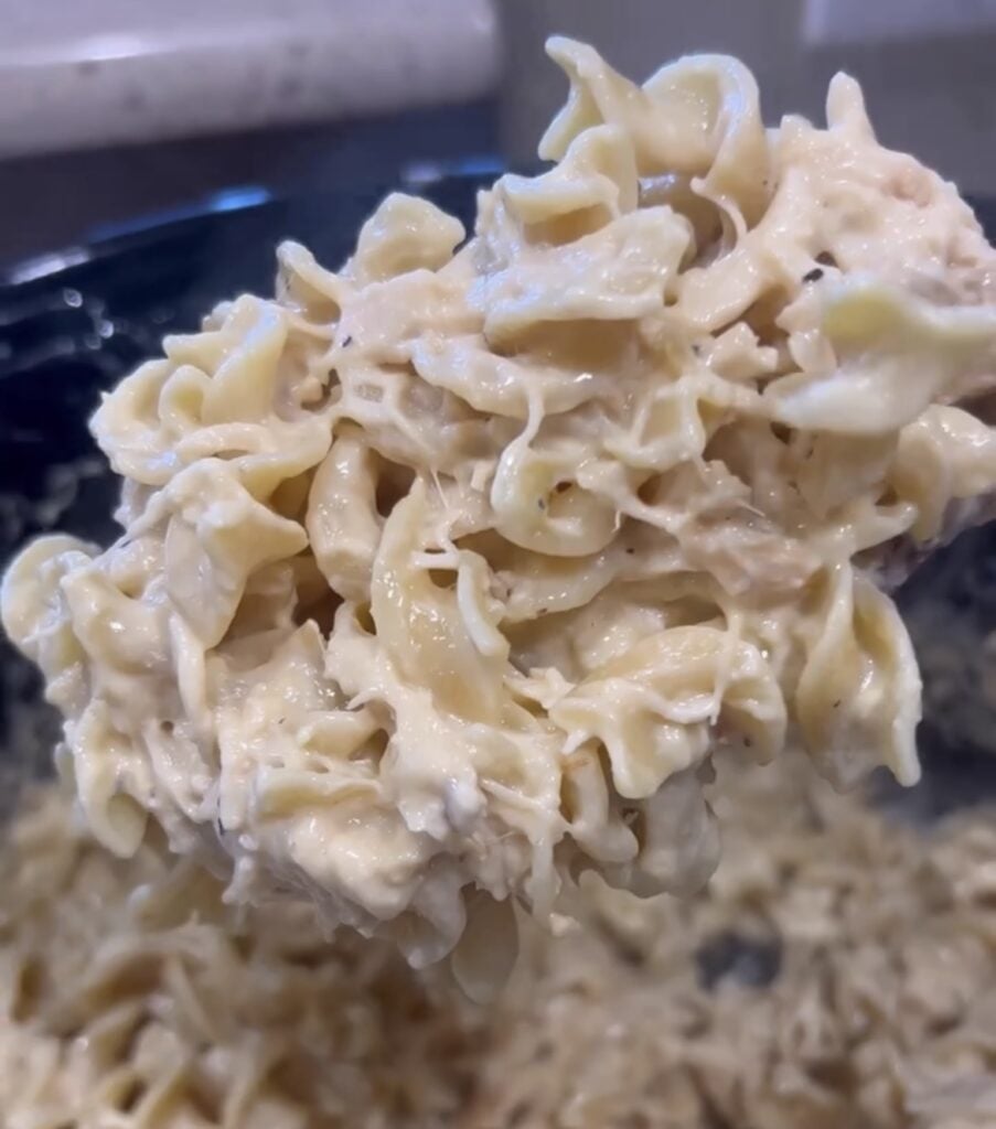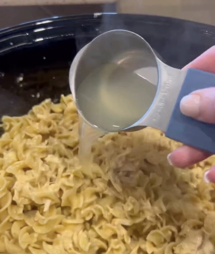 - Cook the noodles for 7-8 minutes until done, strain them and add the cooked noodles to the slow cooker with the shredded chicken