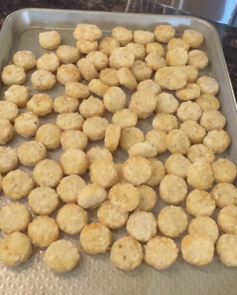 - On a large sheet pan arrange tater tots to bake – you can line with parchment paper if you choose