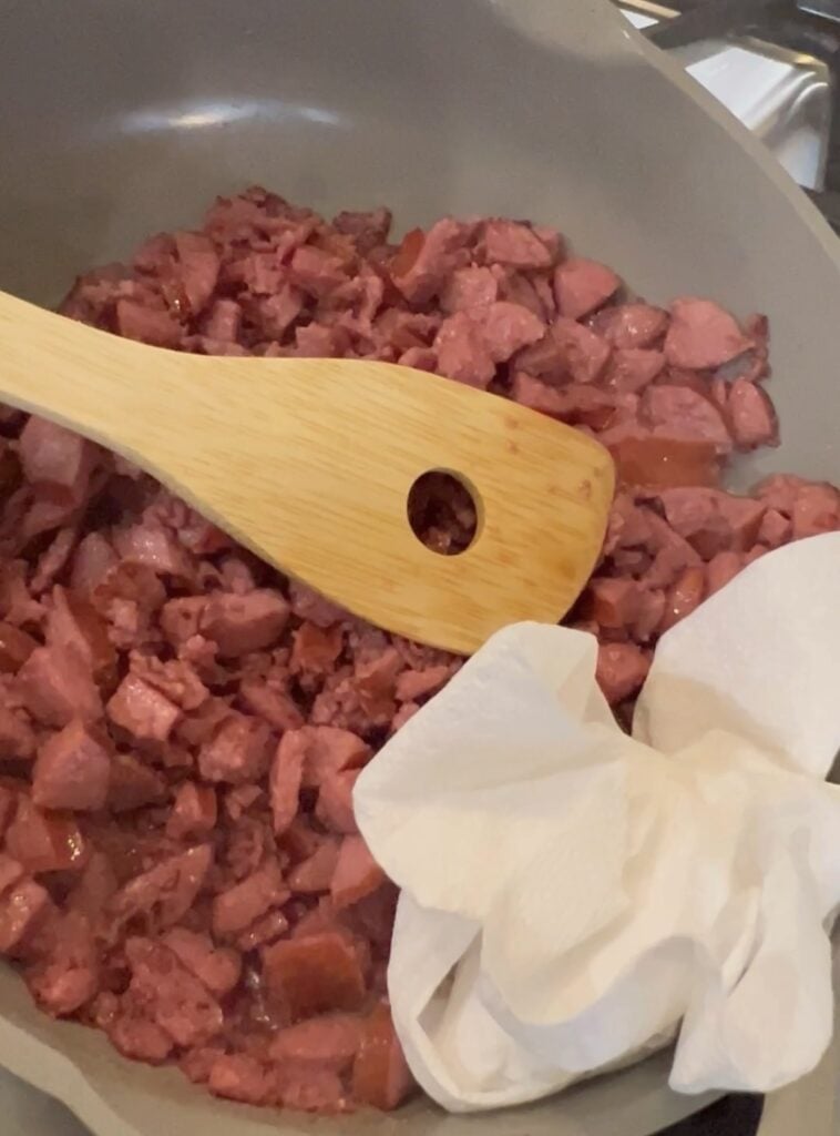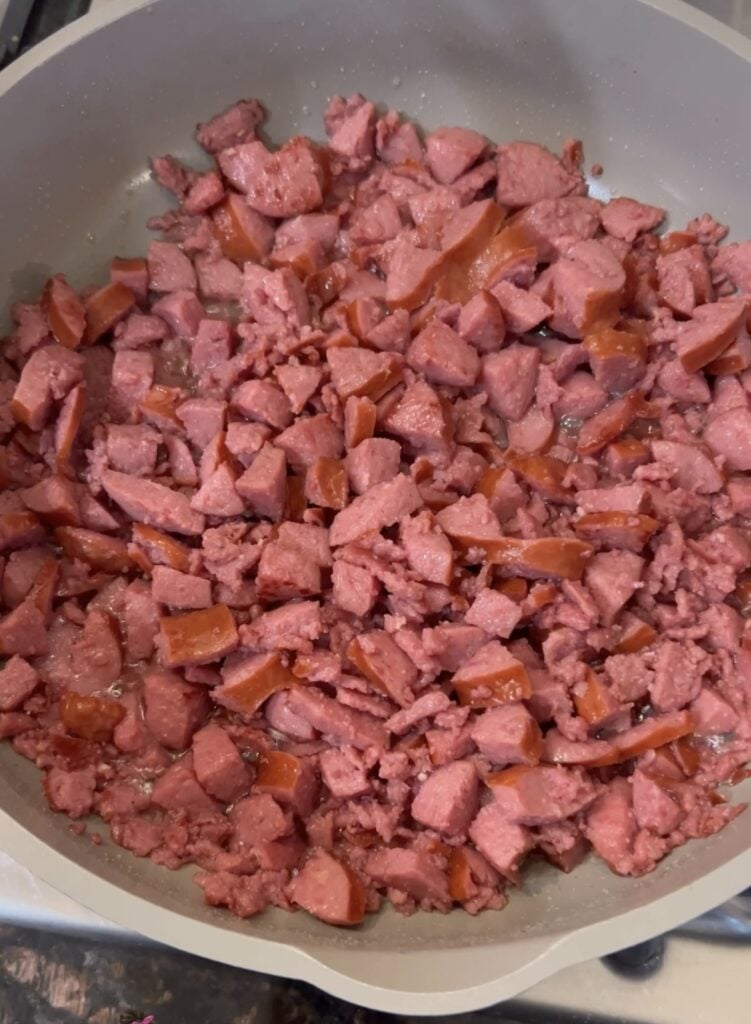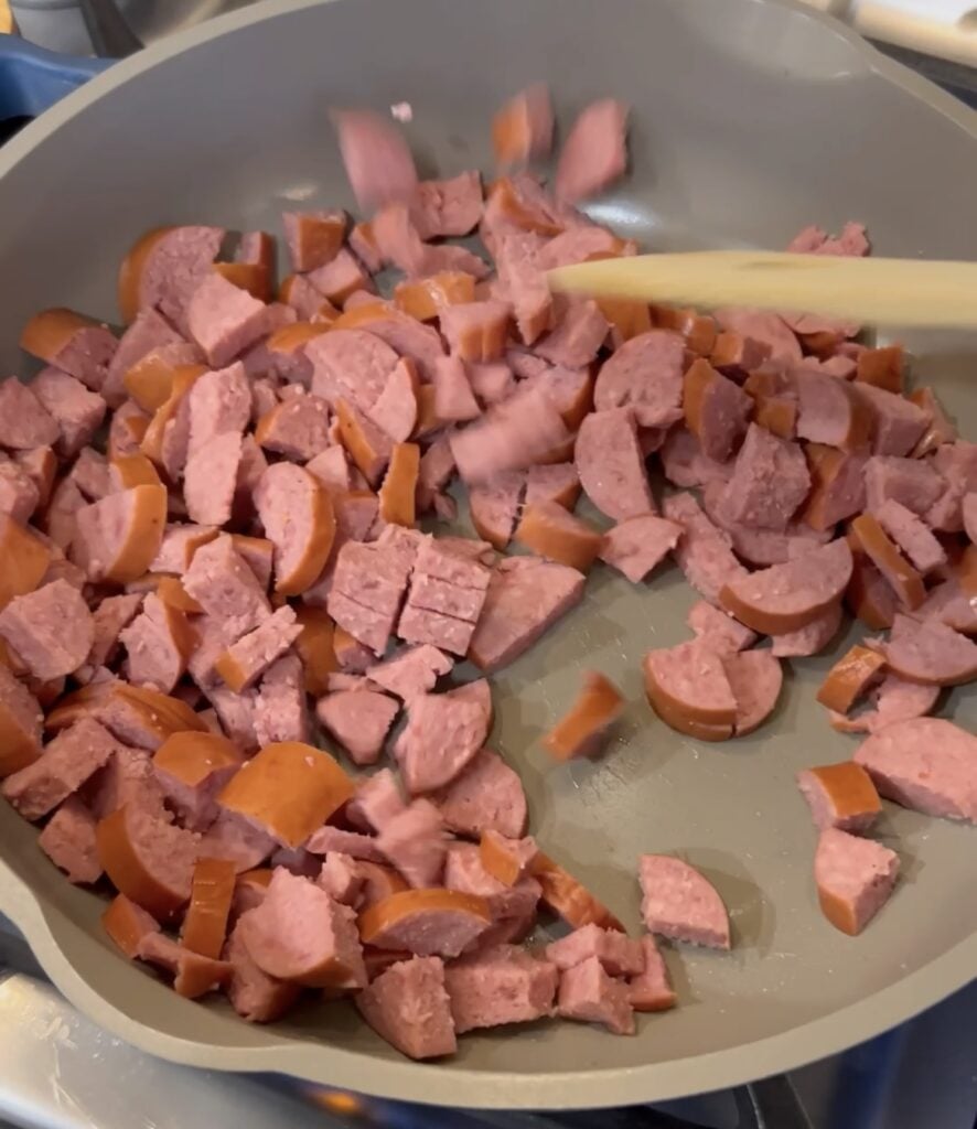 - place diced up smoked sausage in a skillet and brown for 10 mins