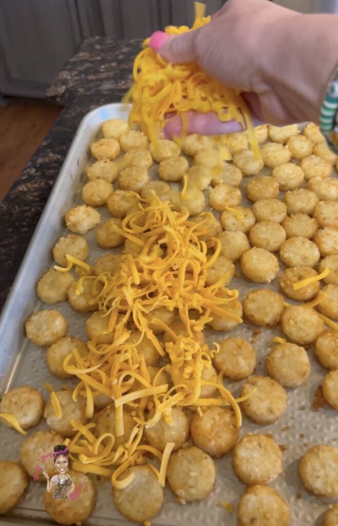 Once tater tots are crispy take them out of the oven. Then add shredded cheese right away to the tots (reserve about 1/2 cup)