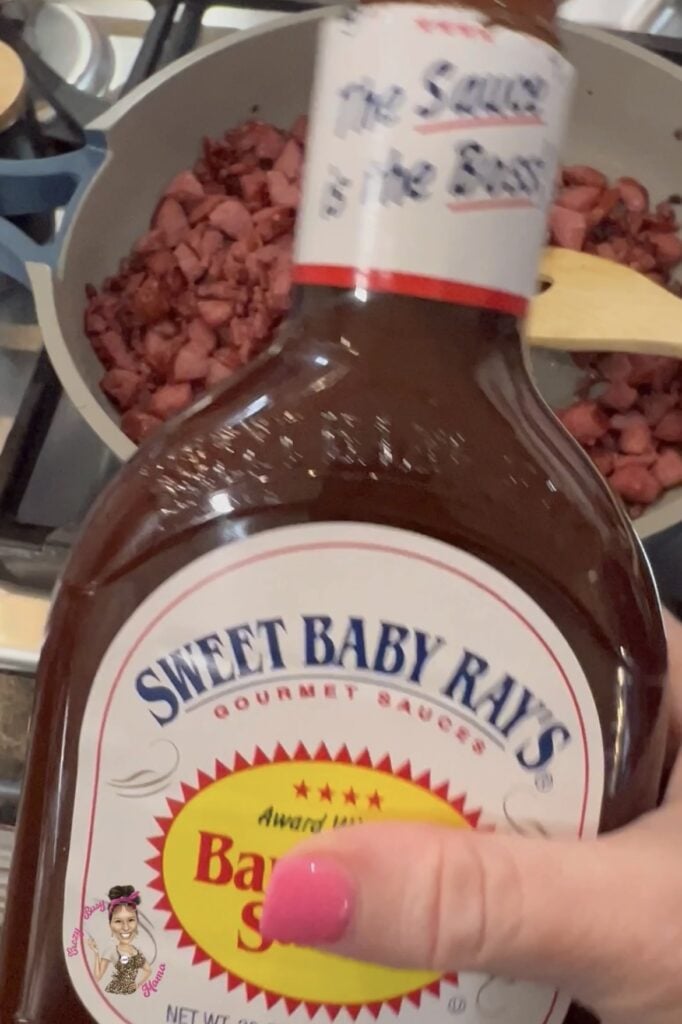 Once you have removed unwanted grease, add BBQ sauce to the smoked sausage and let it come to a simmer