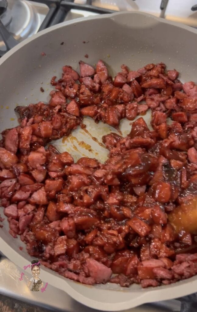 - once you have removed unwanted grease, add BBQ sauce to the smoked sausage and let it come to a simmer