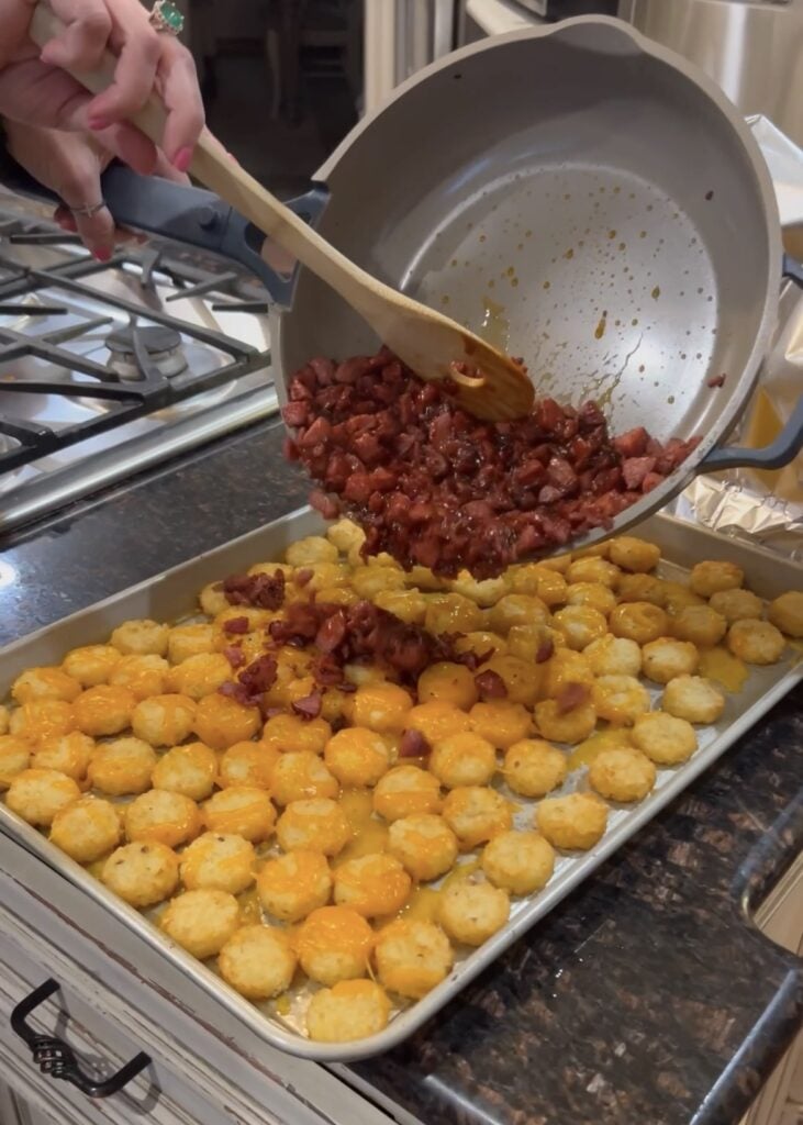 - add shredded cheese right away to the tots (reserve about 1/2 cup)