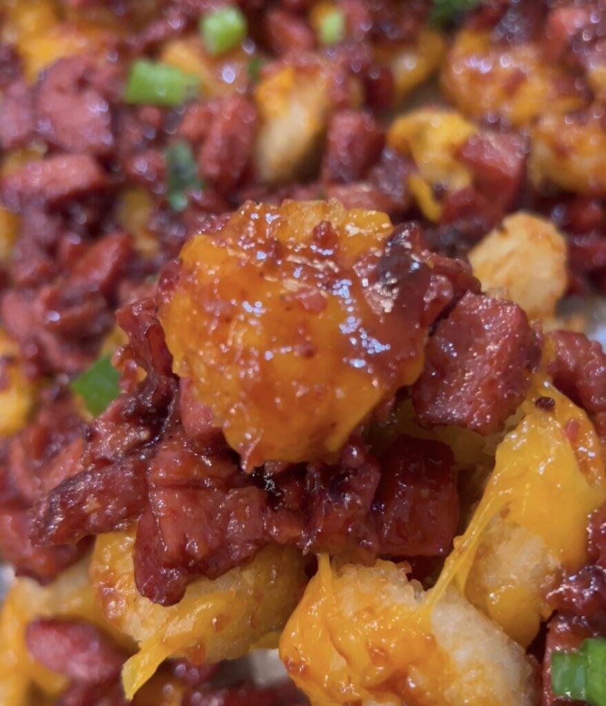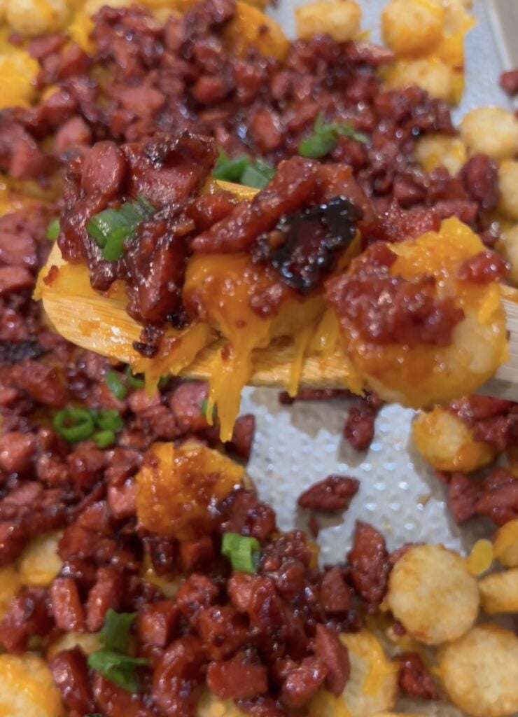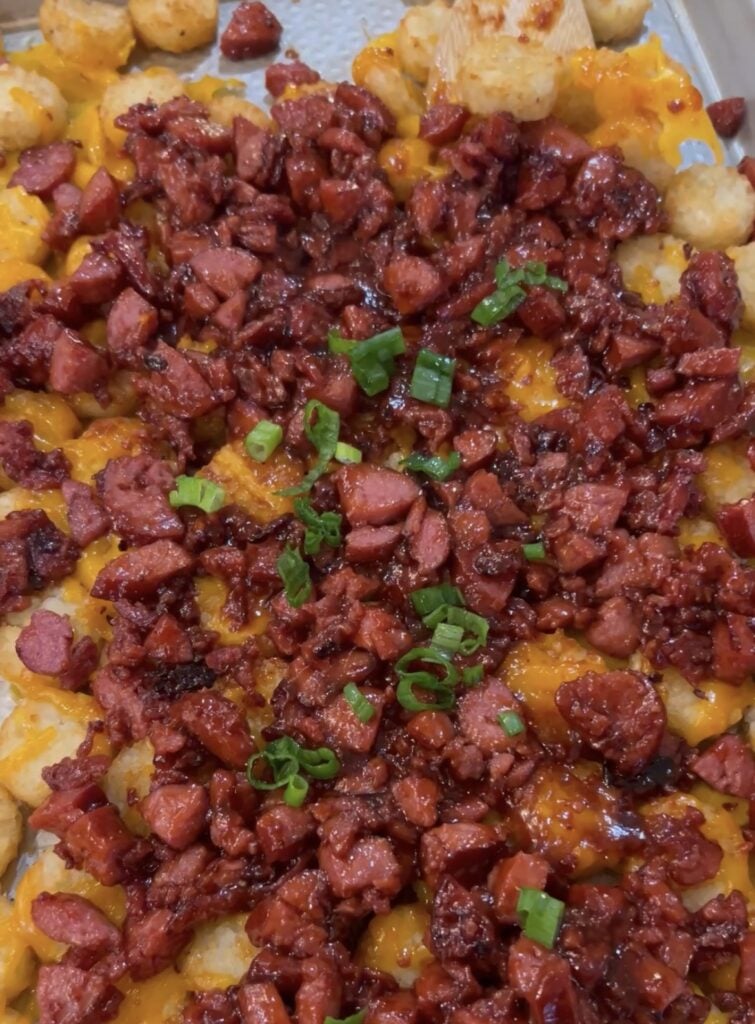 - take the cooked smoked BBQ sausage and pour right on top of the crispy tots