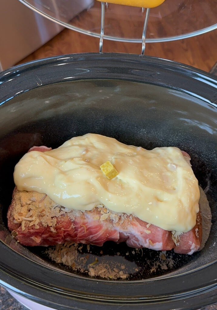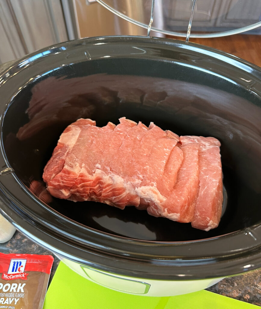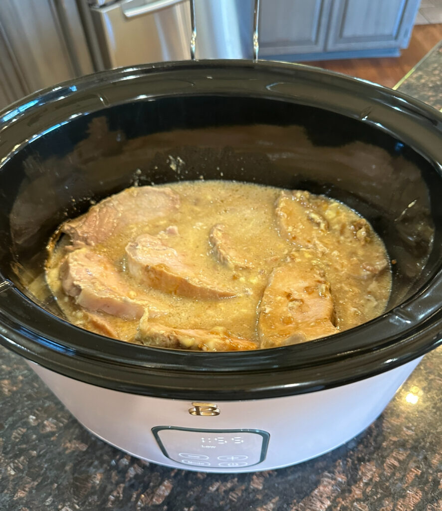 - In your slow cooker add pork chops with all ingredients on top of pork. Place lid on slow cooker and place temp on low for 6-8 hours – or high for 4-6 hours