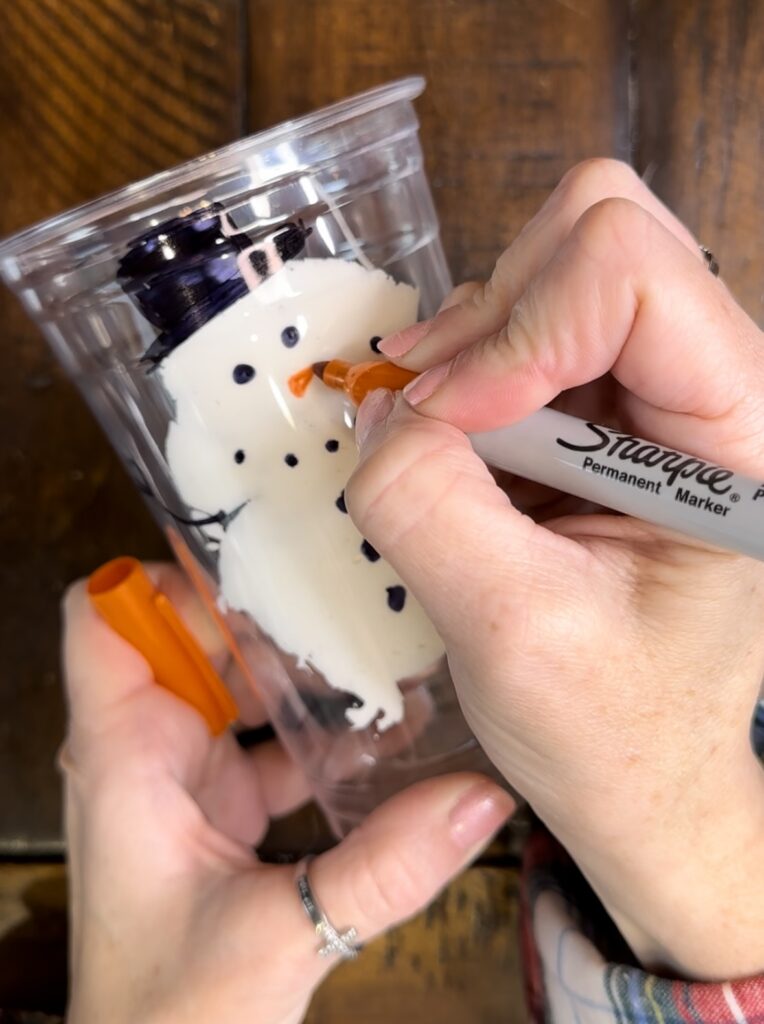 - Once you make the body with marshmallow creme grab those sharpies and create the top hat, coal eyes and buttons and that orange sharpie for the carrot nose!