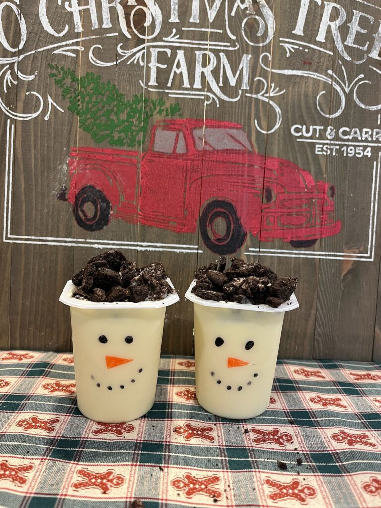 - Fill each cup about ¾ full with vanilla pudding. This will be Frosty’s snowy body.