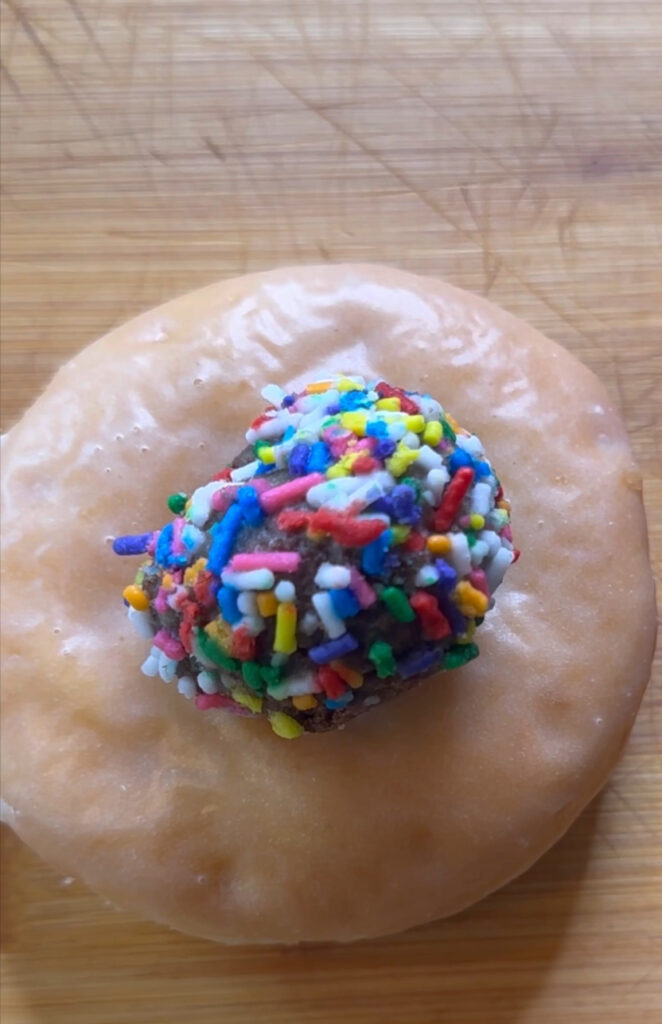 Then grab a chocolate donut hole (sprinkled or not) and place down to cover hole on glazed donut. (no need for icing just place in hole should sit down in it securely enough)