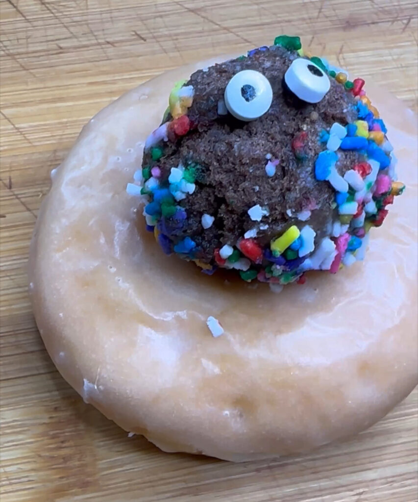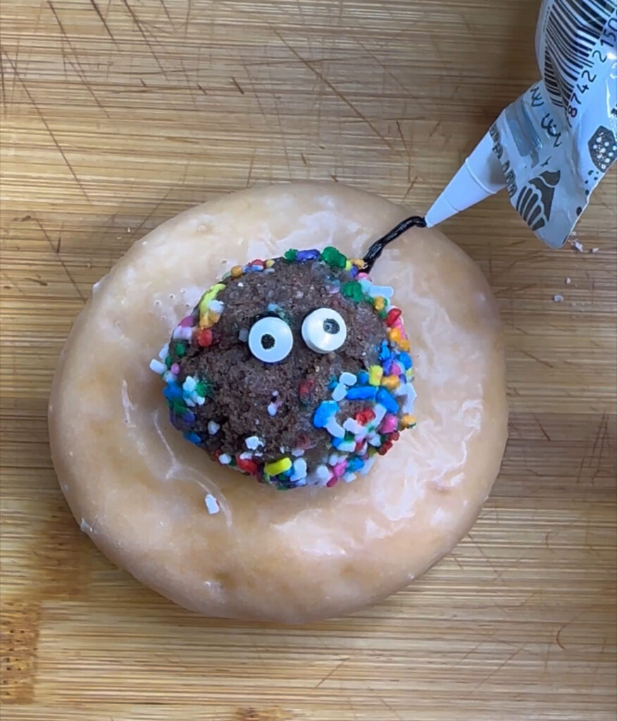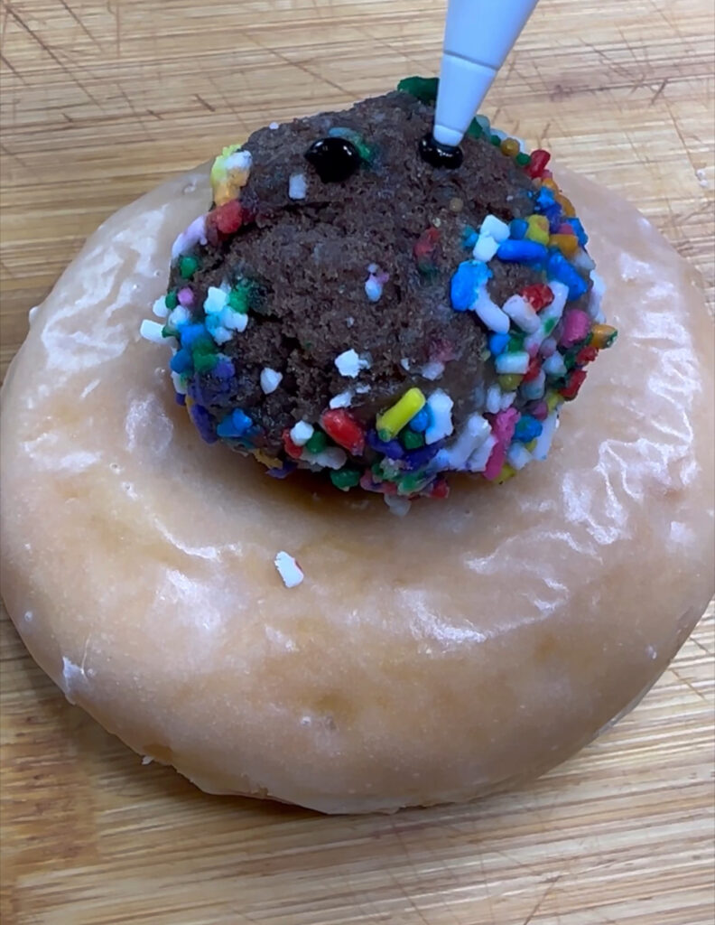 - Then grab a chocolate donut hole (sprinkled or not) and place down to cover hole on glazed donut. (no need for icing just place in hole should sit down in it securely enough)