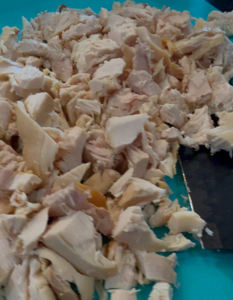 - Debone and shred or cut up chicken set aside