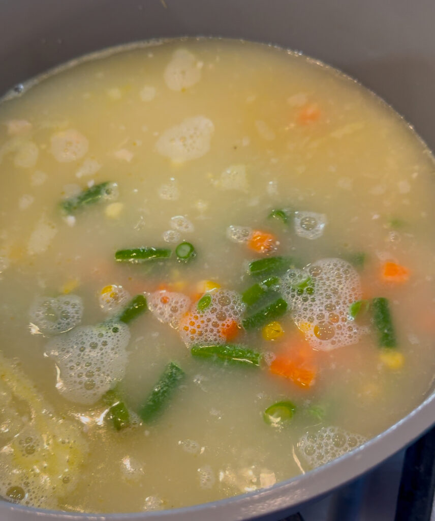 Then place bag of frozen vegetables in broth with chicken and stir