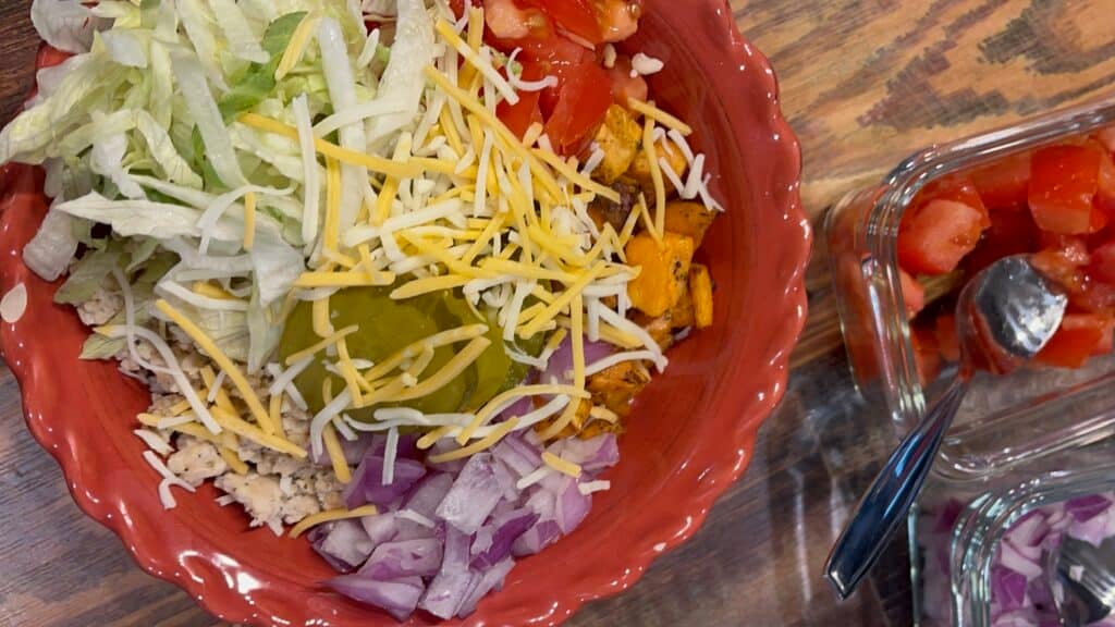 This bowl comes together in layers — roasted sweet potatoes, seasoned turkey, and fresh toppings. Once everything is cooked, it’s just assemble-and-enjoy.
