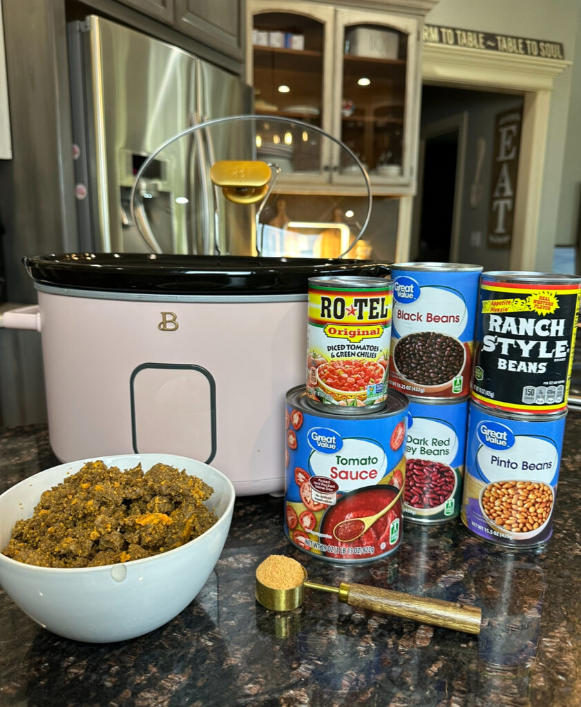 Not pictured is an important ingredient for taco soup which is corn, make sure to add this when you place all ingredients in the slow cooker.