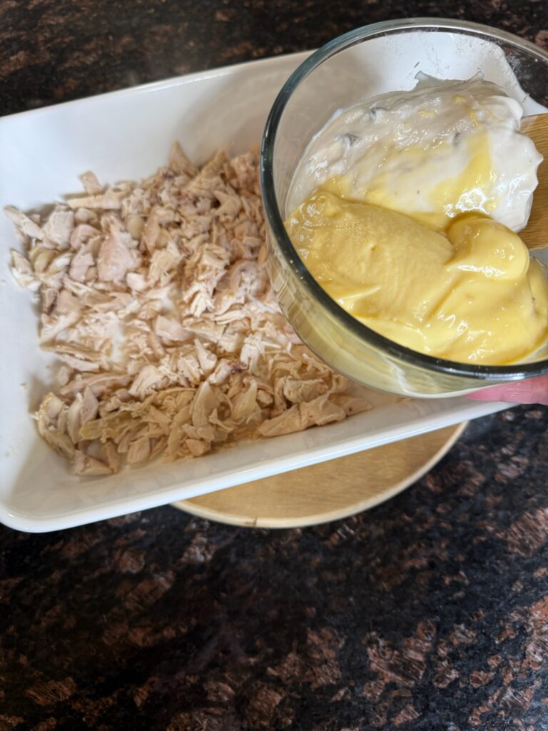 • Shred Rotisserie Chicken and add to the bottom of the pan mixing in cream soups