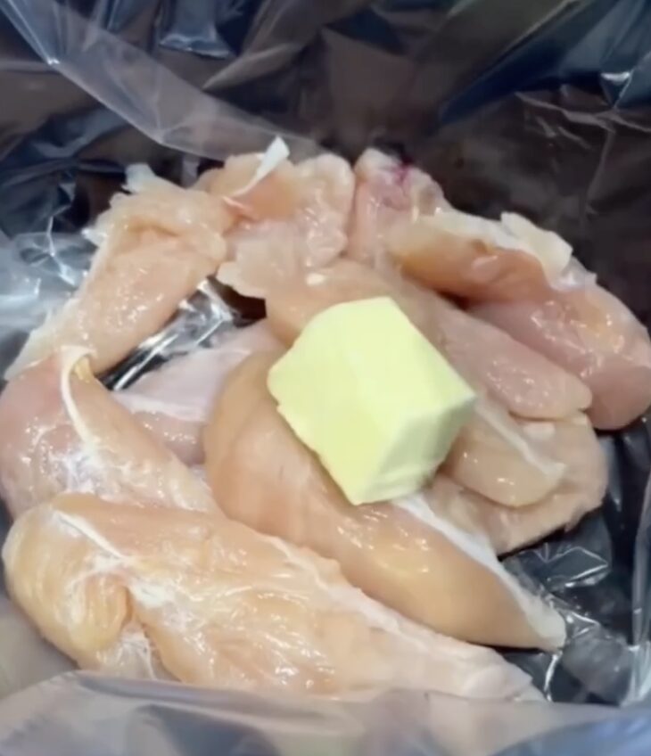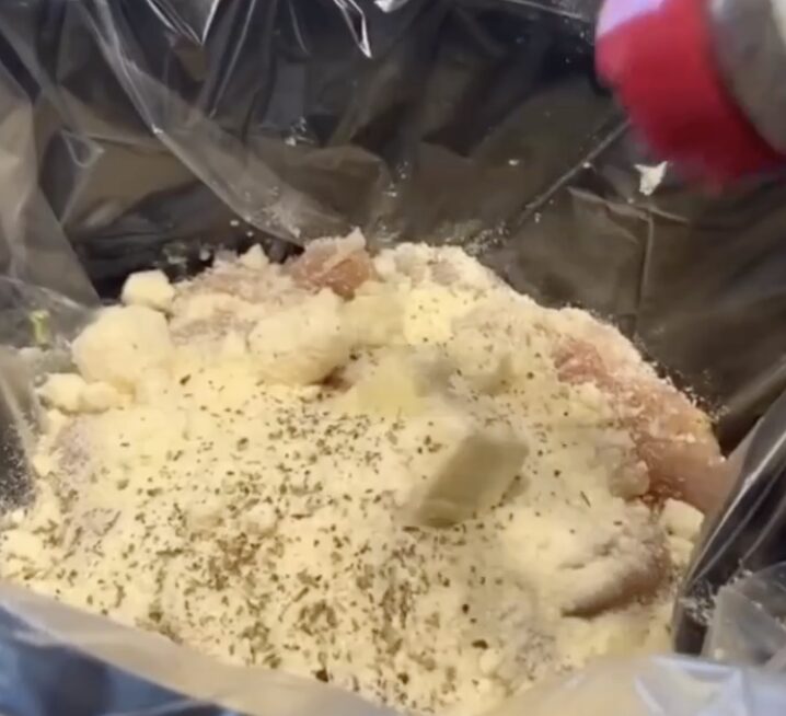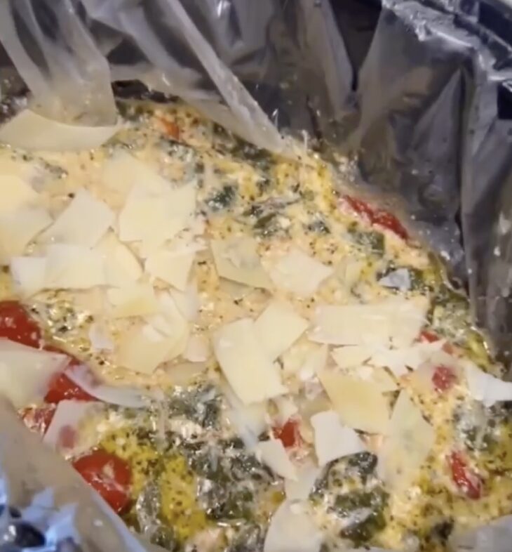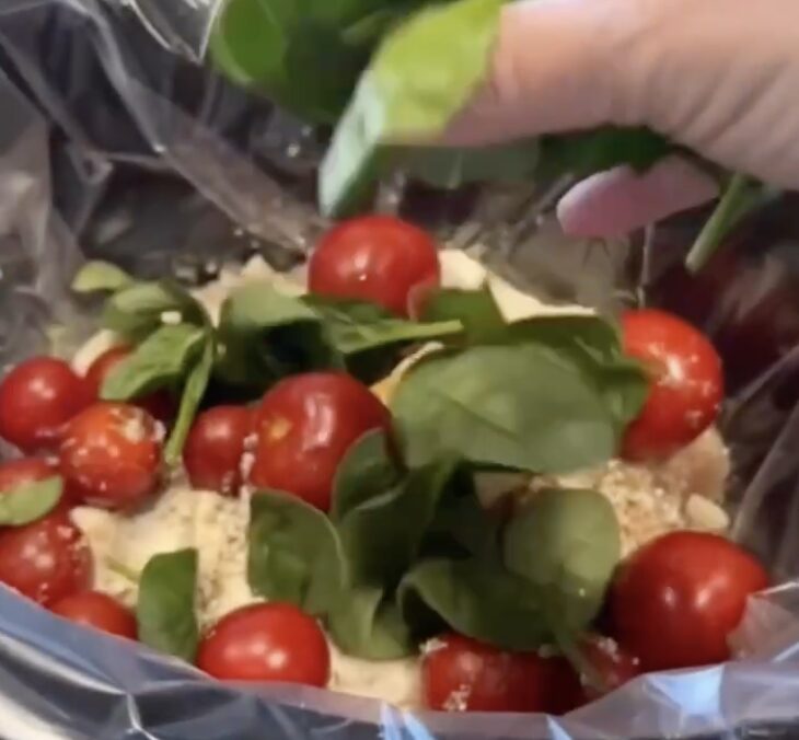 • In a slow cooker combine chicken tenders, butter, garlic, cream, chicken broth, grated parmesan cheese, Italian seasoning, Sea salt, fresh cracked black pepper, tomatoes, Spinach, and red chili pepper flakes (optional)