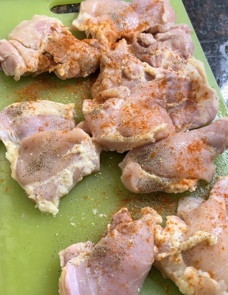 - After trimming the fat off, place chicken thighs on a cutting board and season both sides generously
