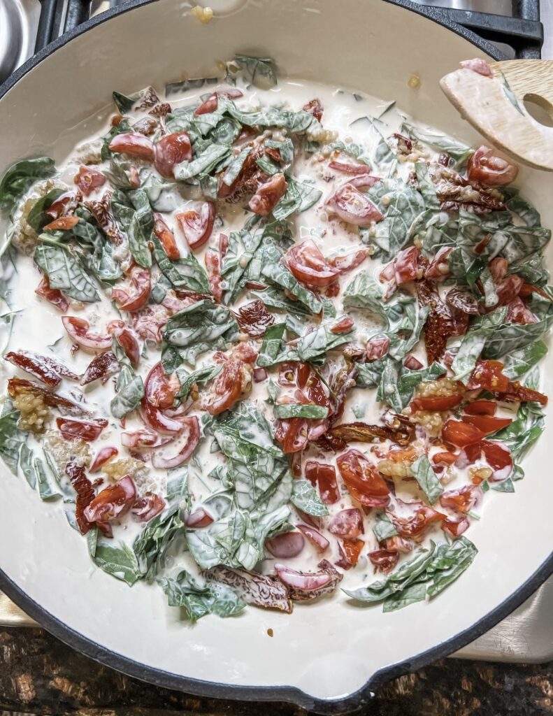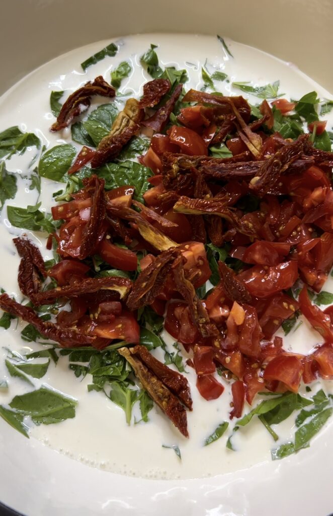 - In cast iron or oven safe dish, pour in heavy whipping cream with spinach, tomatoes, sundried tomatoes