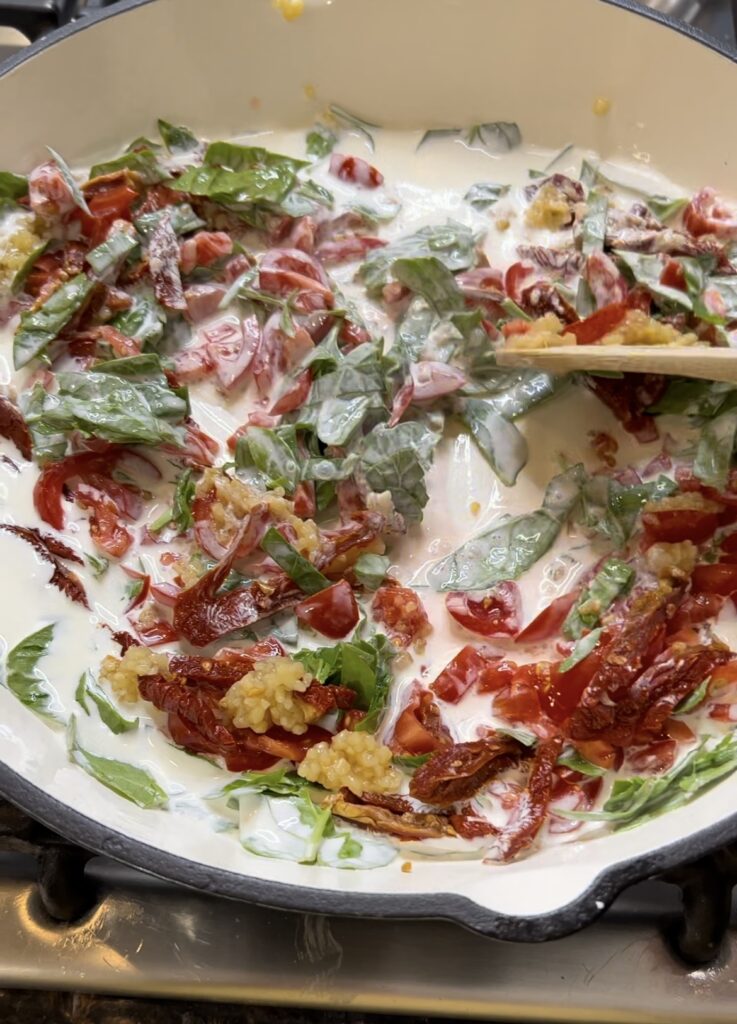 - In cast iron or oven safe dish, pour in heavy whipping cream with spinach, tomatoes, sundried tomatoes and garlic