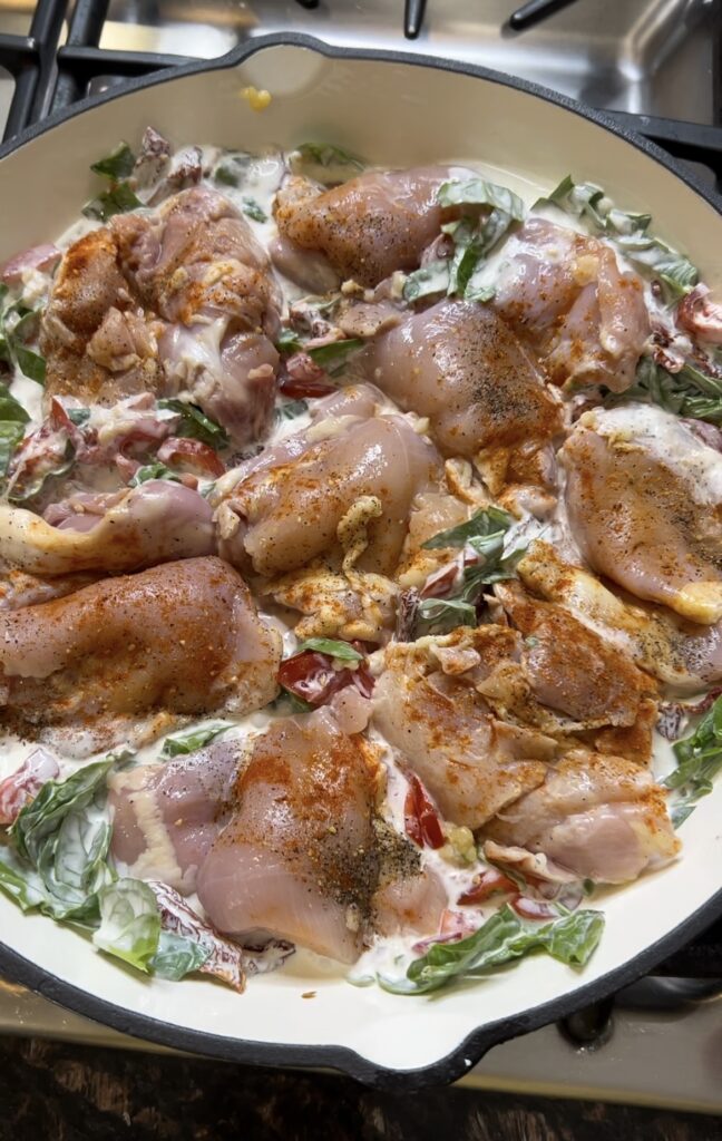 - Once all ingredients are in the cast iron, nestle in each chicken thigh into the mixture