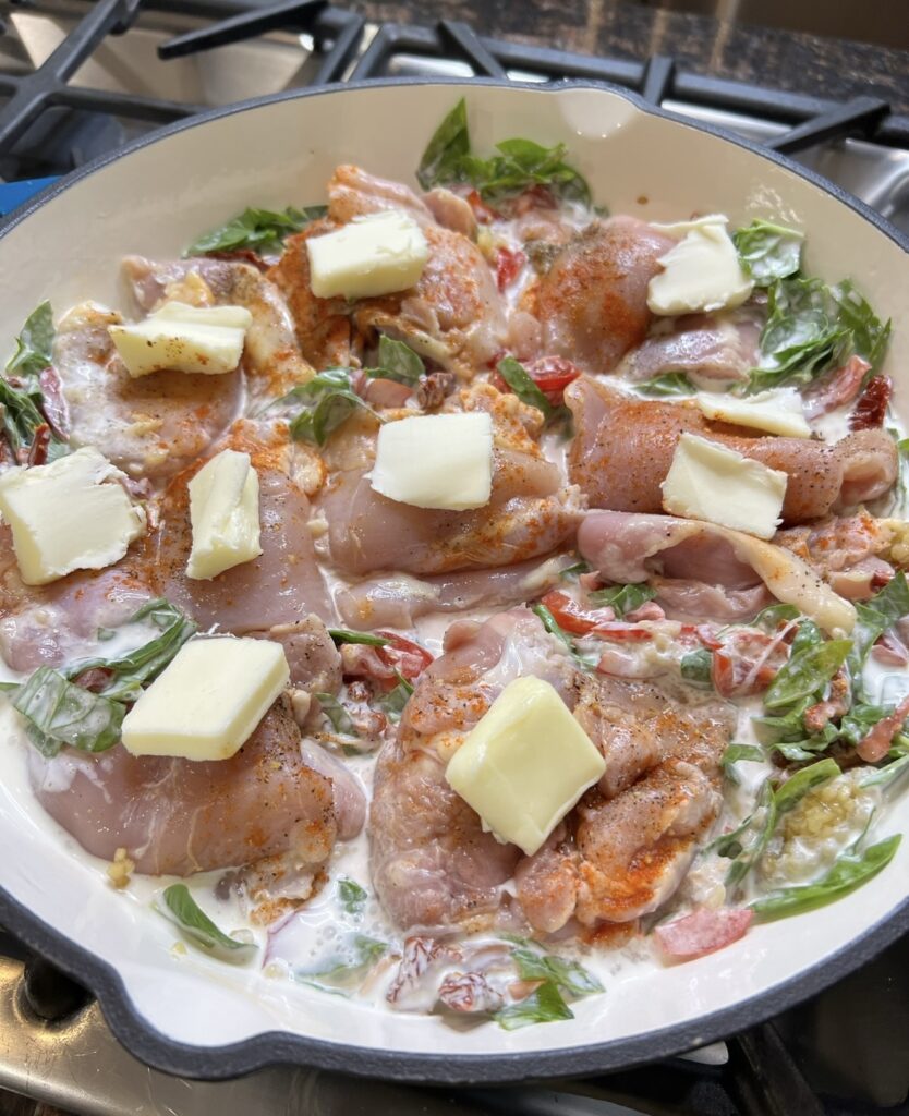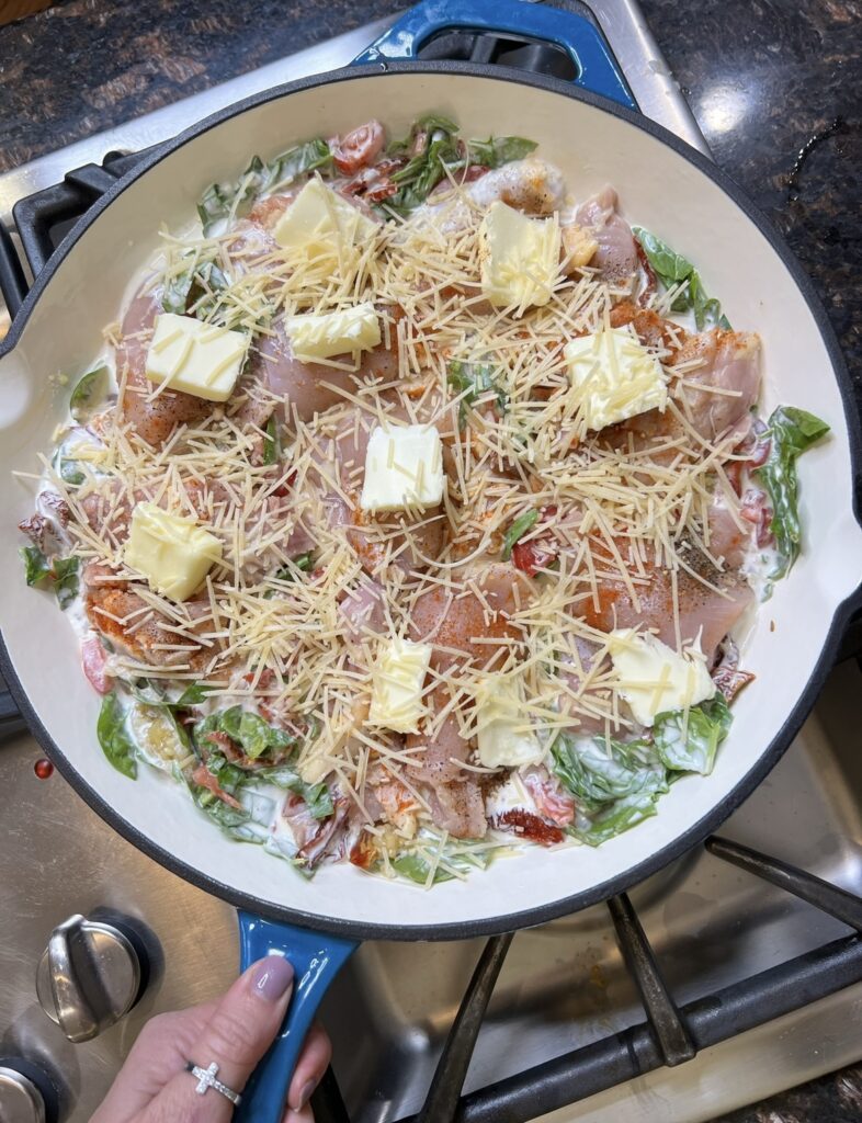 - Add a pad of butter to the top of each chicken thigh along with 1/2 cup of shredded parmesan cheese on top of the dish
