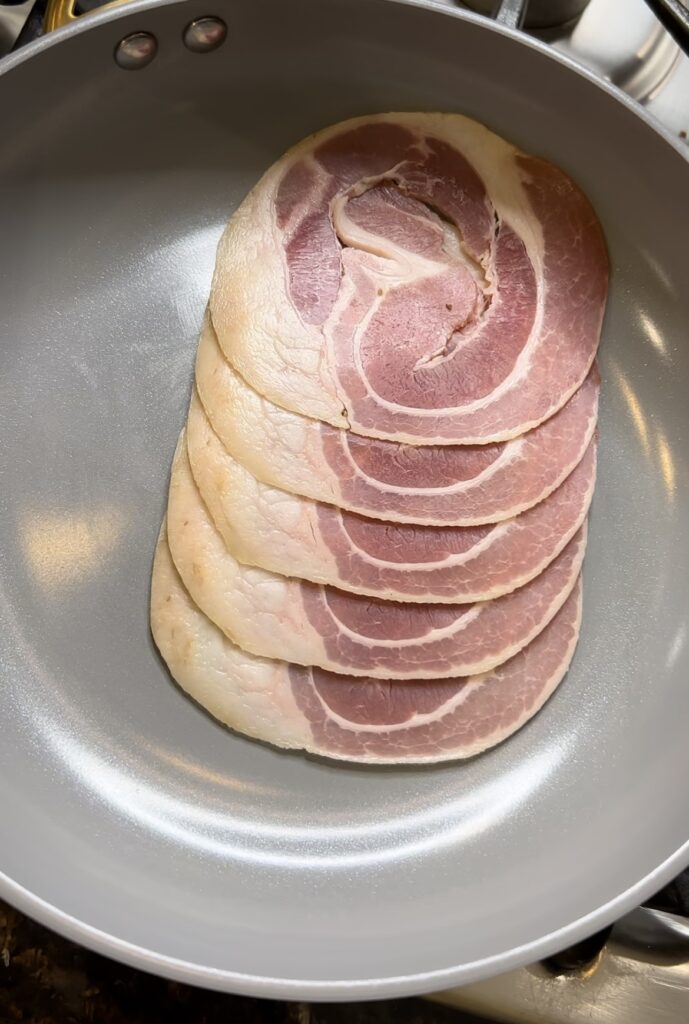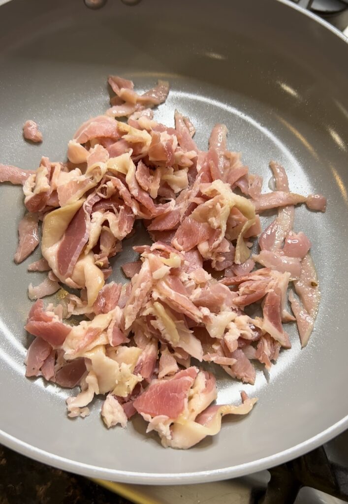 - I cut up the pancetta to look like this
