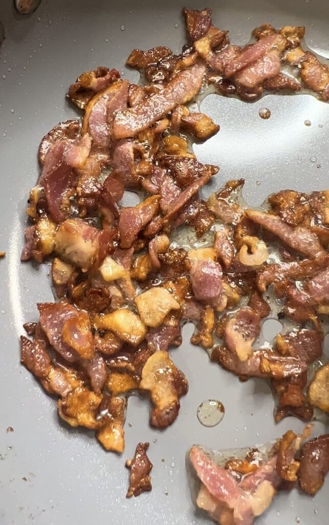 - While the chicken is baking in oven, cut up and fry the pancetta -make sure to blot the grease off the pancetta and set aside