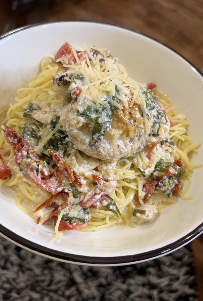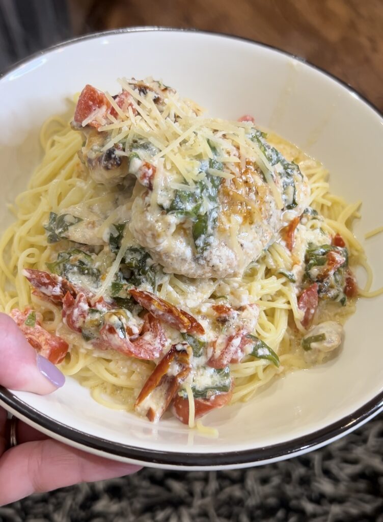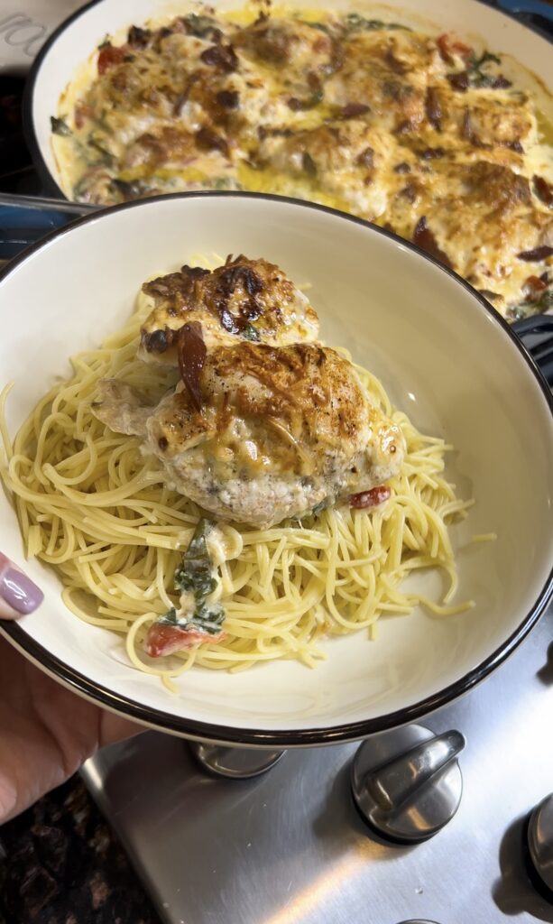 Easy One Pan Tuscan Chicken served over Angel hair pasta was a massive hit and it's pretty dang easy to put together. I would definitely save this one for a weekend or a night where you aren't running in all sorts of directions as it does take closer to an hour from start to finish, but the actual “work” of putting this dish together only takes about 10 mins of prep including the pasta. It not only looks gourmet but thats that way too. It's one once you try you will be putting it on rotation for your family.