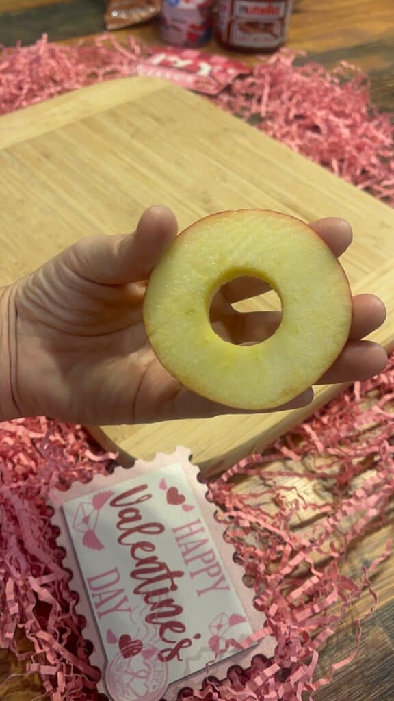 Spread Nutella around the apple ring and add Valentine’s sprinkles.