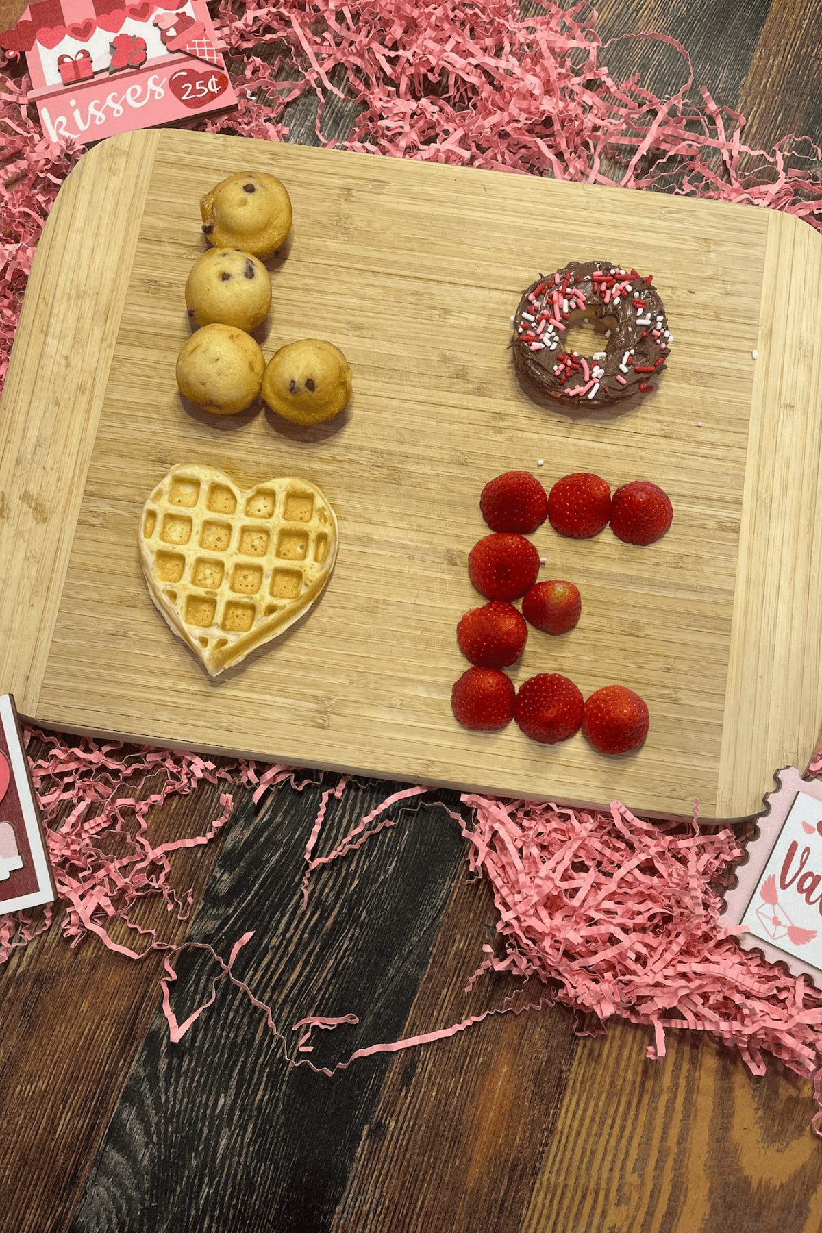 Place heart-shaped waffle beneath the muffins to form the letter V.