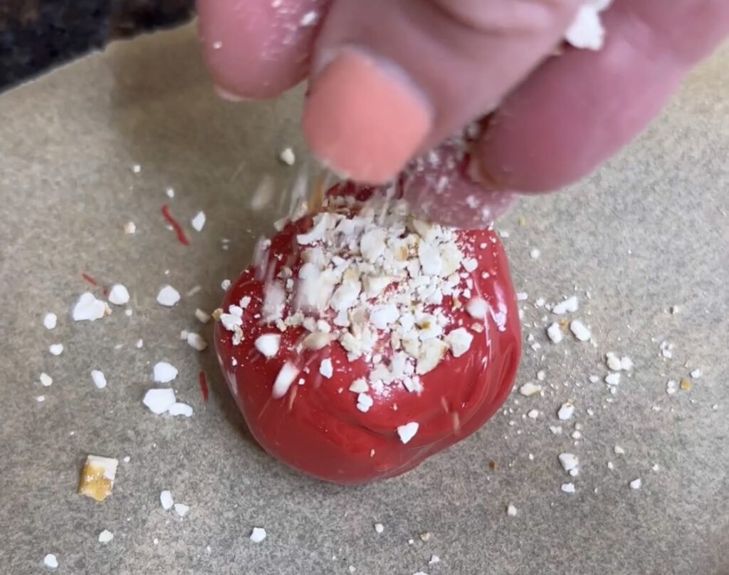 - Place balls without chocolate on them in freezer on sheet pan with parchment paper for about 5-7 mins