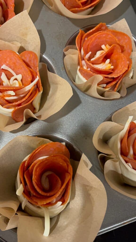 - Preheat the oven to 375°F and grease a muffin tin (this helps the pizza roses hold their shape).