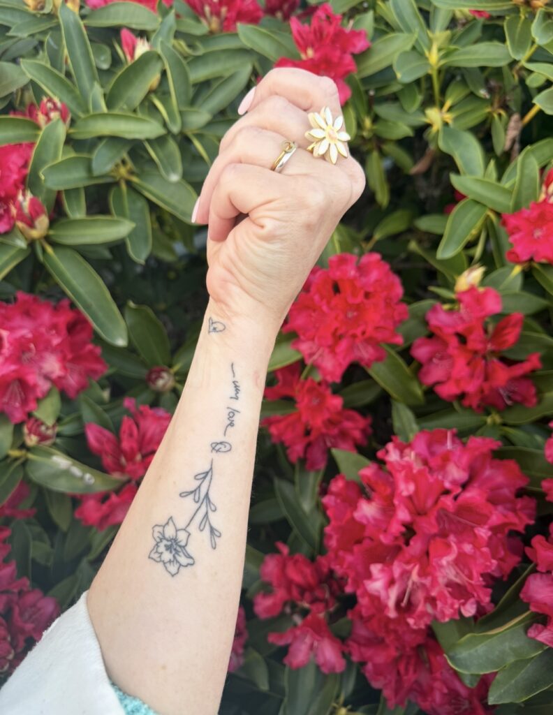 So my tattoo became both: Quintin’s handwriting, pulled from a love letter he left me—and his birth flower, found in a quiet garden, on a retreat meant for healing.