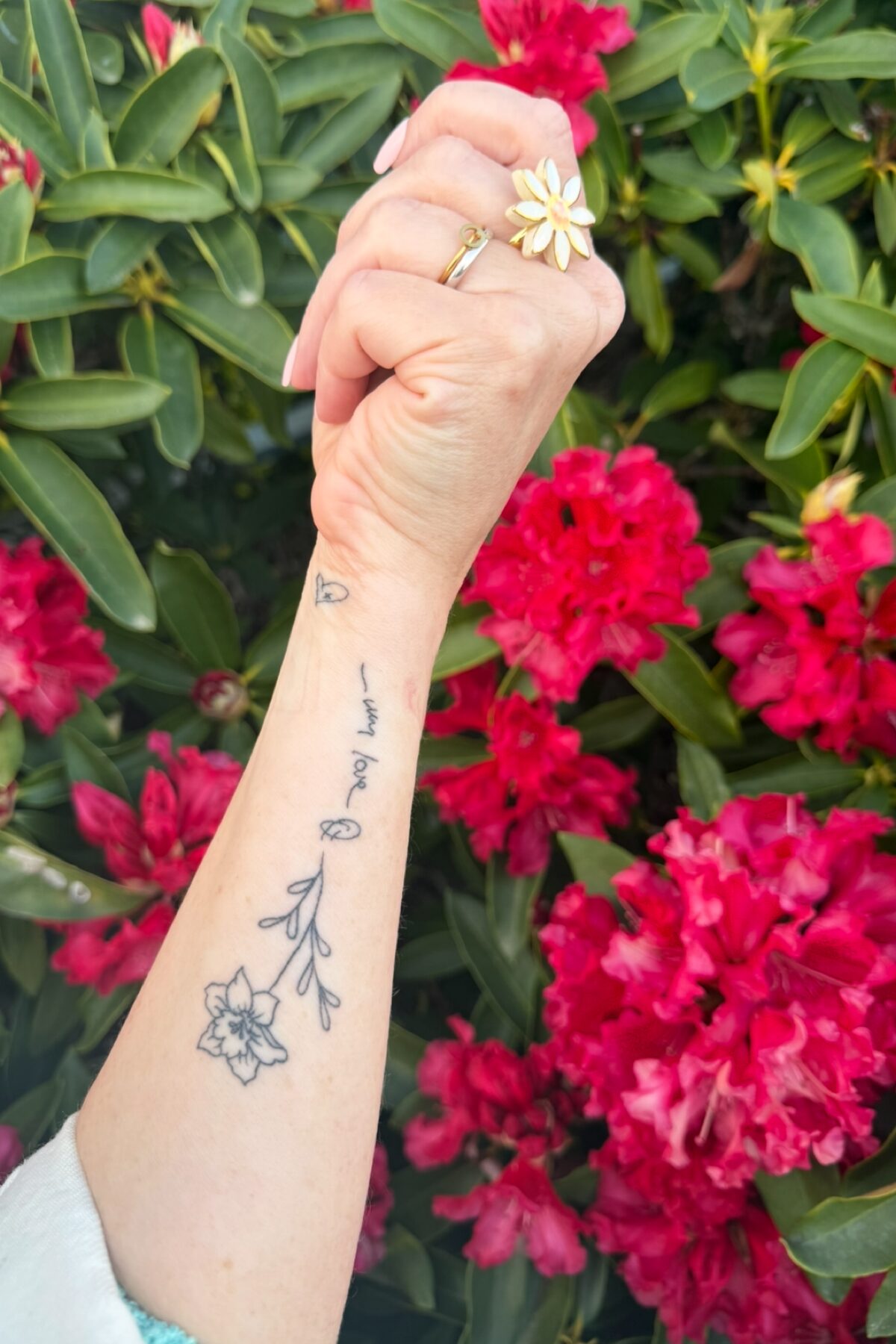 So my tattoo became both: Quintin’s handwriting, pulled from a love letter he left me—and his birth flower, found in a quiet garden, on a retreat meant for healing.