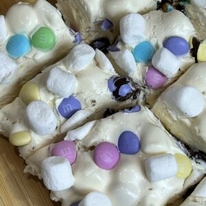 Top with the remaining marshmallows and candies. Let set completely before cutting into squares.