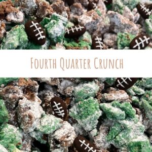 4th Quarter Crunch is a football-themed twist on classic puppy chow (also called Muddy Buddies) that’s perfect for game day snacking. It combines crunchy Chex cereal coated in chocolate-peanut butter or green candy melts, dusted with powdered sugar, and topped with adorable chocolate-covered almond “footballs.” The mix looks like a football field, tastes like a sweet-and-salty touchdown, and is easy enough for kids to help make — making it a true game day MVP.