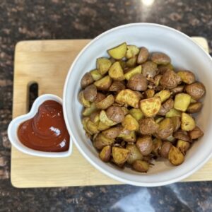 Once potatoes are covered, you will pour into your air fryer at 400 for 20-22 minutes until you can pierce with a fork.