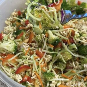 In a medium size bowl Add all dressing ingredients including the ramen seasoning packet (not noodles) and combine well with whisk.