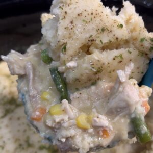 Then add Frozen vegetables to slow cooker and place lid on while mixing up the drop biscuits.