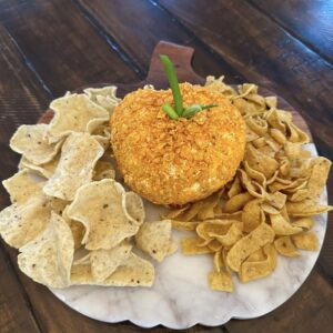 This is a great cheeseball dip! So easy to throw together and if you use nacho cheddar doritos it will give you the perfect color for a pumpkin. If you were creating a spread for a larger crowd you could do another pumpkin cheeseball with cool ranch dorito giving it a pumpkin patch appearance with all colors of pumpkins. However, you decide to present this will be a dip that everyone will be begging for each and every year!