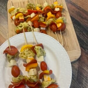 Thread ingredients onto skewers, alternating for color and texture.Example: pepperoni → pepper → tortellini → cheese → tomato.