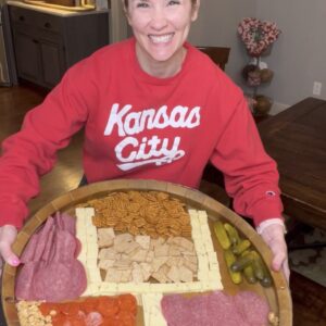 Love having a lazy susan style charcuterie board for this makes it super easy to serve this way. Also love the wine barrel lazy susan as it gives it s nice lip so nothing falls off. When you start building this Football Charcuterie Board start with the cheese goal post and work from there. This will help to build a foundation for the board allowing your to build out with favorite crackers, meats, pickles and nuts.