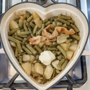 In medium high heat, in Dutch oven or pot cook bacon with onion for 4-5 mins