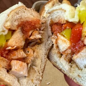 Once hoagies are sliced on top, you will want to stuff full with chicken and top with marinara, cheese and then any toppings you desire.